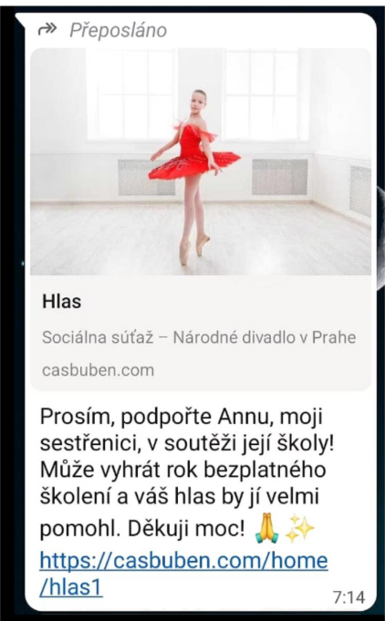 Je možné, že od některého z vašich kontaktů obdržíte do WhatsApp aplikace zprávu s žádostí o podporu formou hlasování. Např.: podpoř neteř/dceru mého kamaráda, aby získala stipendium na taneční škole.